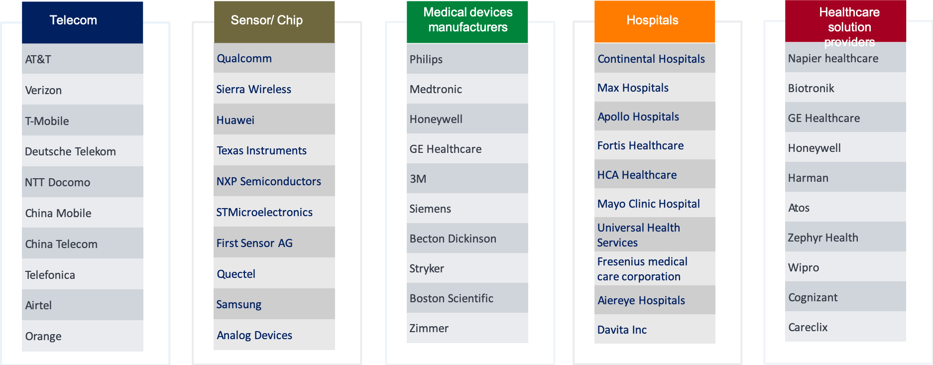 The lists of companies identified by Dolcera which are part of the 5G healthcare system are provided in Figure.3 below: