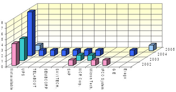 The present graph and interpretation is based on selected 30 records. The graph indicate SAP as leading and consistent player with 3 patent records. EXAGO seems to be the new entrant in 2005. It is interesting to note that the competitors in 2004 have not shown any activity in the beginning of 2005.