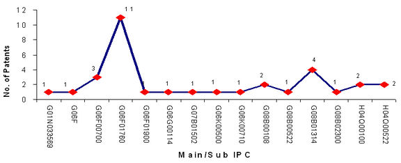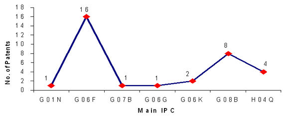 The present graph and interpretation is based on selected 30 records. It is evident from graph that G06F(Electric Digital Data Processing) Technology is widely used in RFID based supply chain applications showing continues progress through out. The progress indicates key technology area targeted by many players and having market potential. Followed by G08B (Signaling), H04Q (Electric Communication Technique ) and G06K (Recognition of data; Presentation of data; Record carriers; Handling record carriers).