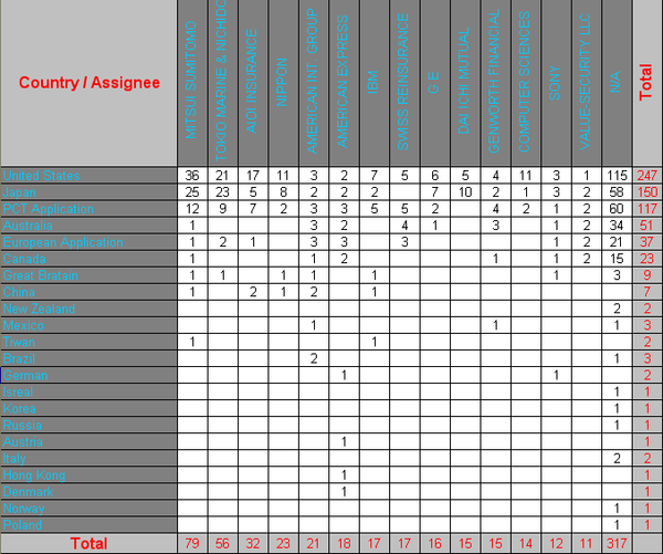 - United States with 506 patent records is the most happening destination for insurance related IP activities followed by Japan (314) and Australia (9)