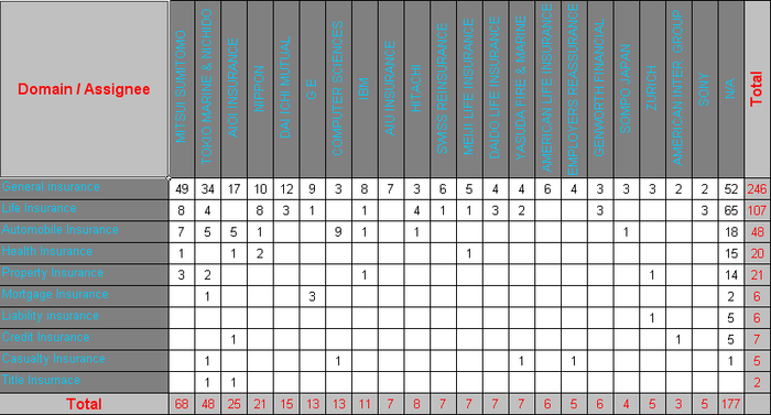- MITSUI SUMITOMO INSURANCE leading in IP activity race with 60 patents to its credit, followed by TOKIO MARINE & FIRE INSURANCE with 49 and AIOI INSURANCE with 23 patent records to their credit