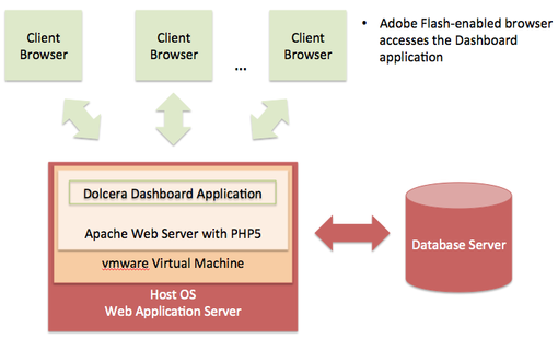 The Dolcera Dashboard application is a PHP web application that runs on the Apache web server with PHP5, and connects to a PostgreSQL or Oracle database. The client application is a Flash application running inside the web browser.