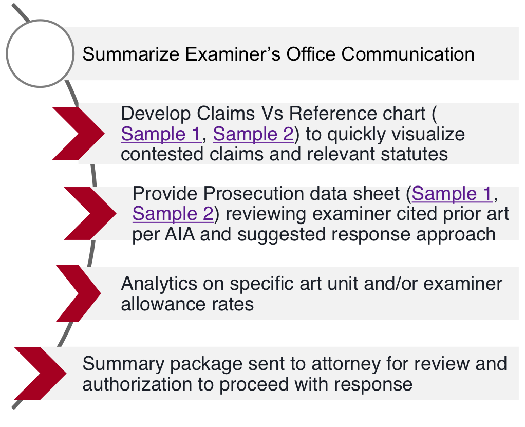 - Note:The prosecution data sheet is a brief of the proposed amendment/argument which is sent to the client attorney. This process may be adapted according to client needs.