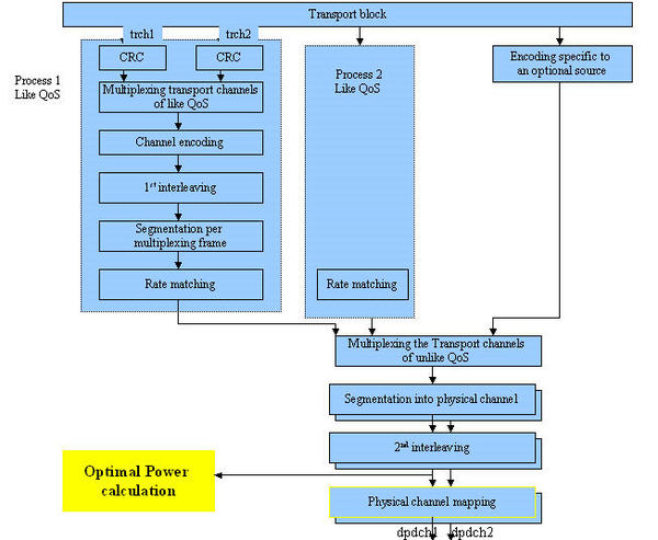 The following framework highlights the various steps involved in providing variable QoS. The received data from the transport block is classified into different processes based on their QoS. Data is split onto various transport channels to which a CRC code is attached for error correction. Further, all these transport channels are multiplexed on one line by concatenation, interleaved, segmented and then rate matched. The rate matching step is performed using the rate matching ratio and puncturing ratio which is received from the sending entity (an exchange of handshaking signals occurs).
