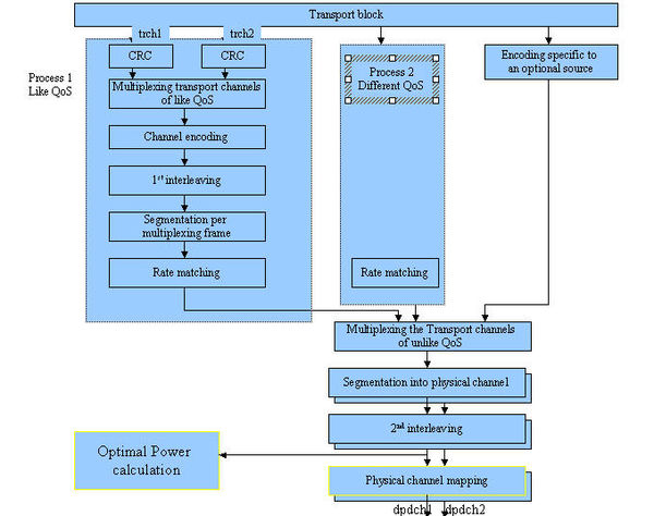 CDMA is being accepted as a third generation (3G) system and a specific feature of 3G systems is that they offer a radio interface adapted for all kinds of services and combination of services (such as data, voice, video etc). The big challenge is multiplexing these services which do not have the same demands in terms of quality of service(QoS) which can be represented as BER(bit error rate), processing delay, frame error rate etc. Different QoS will require different channel encoding and interleaving strategies. The demand of BER can be satisfied when the coding bits have at least a code dependent ratio Eb/I(ratio of bit energy to interference). There are several influences that might change system performance(BER) and hence Eb/I ratio, of which the most effective is variation of Bit Rate by a step of Rate Matching. The standard framework for the management of QoS in CDMA systems is shown below. The following framework highlights the various steps involved in providing variable QoS. The received data from the transport block is classified into different processes based on their QoS. Data is split onto various transport channels to which a CRC code is attached for error correction. Further, all these transport channels are multiplexed on one line by concatenation, interleaved, segmented and then rate matched. The rate matching step is performed using the rate matching ratio and puncturing ratio which is received from the sending entity (an exchange of handshaking signals occurs).