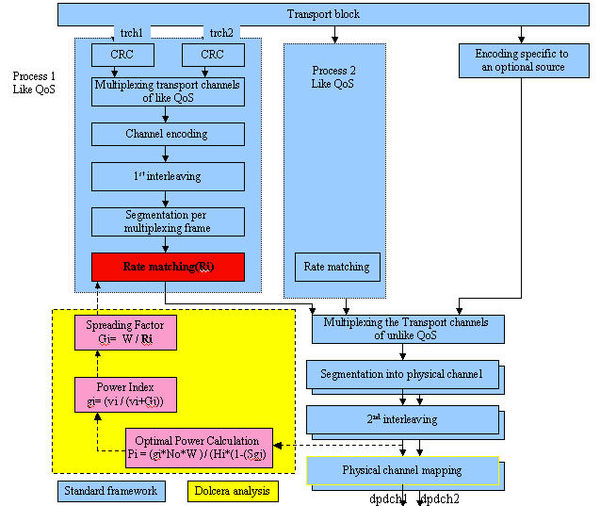 The patent EP1385290 titled "Method for balancing Eb/I ratio in a service multiplexing CDMA system and a telecommunication system using this method" targets this concept of Rate matching and introduces an algorithm for calculating effective data output bits by a process of repetition or puncturing of the input bits governed by a rate matching ratio and puncturing ratio received from the sending entity (can be a BS or MS). As the number of services increases the number of potential combinations will also increase. There arises a need for simple arithmetic procedures to calculate the transport sizes which is done using the following three rules.
