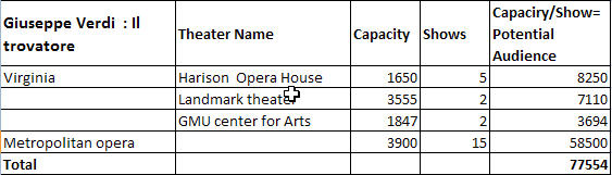 This spread sheet are prepared from the data obtained from the http://www.operabase.com/view.cgi?cc=us from where we were able to extract the information pertaining to various company in opera business. This information was then broke down, and the following excel sheets were prepared.