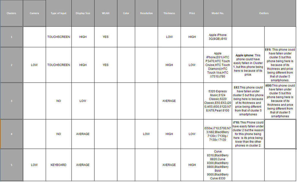 The matrices presented here show the common attributes for each cluster identified above and list the smart-phone models for each. The outliers are the models which could have fallen into some other cluster barring a particular attribute. This has been explained in the notes.