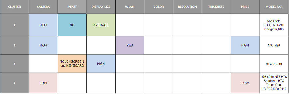 The sheet below shows the clusters formed for the candy-bar phones.