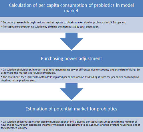 | Country | Compared Geography | Probiotic Market in US in Mn $ | US Population 2008 in Thousands | Per Capita Probiotic Consumption (in $) | PPP Adjustment Factor | PPP Adjusted Consumption Per Capita in ($) | Households with high Disposable Income (in thousands) | Average number of people per household | Potential Market for Probiotics (in Mn $) |