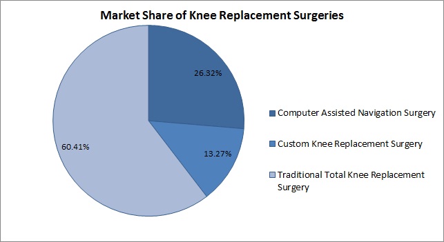 Traditional Total Knee Replacement Surgery account for 60% of the market share followed by Computer Assisted Navigation Surgery(26.32%) and Custom Knee Replacement Surgery(13.27%).