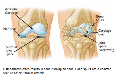 - Osteoarthritis - This is an age-related "wear and tear" type of arthritis. It usually occurs in people 50 years of age and older, but may occur in younger people, too. The cartilage that cushions the bones of the knee softens and wears away. The bones then rub against one another, causing knee pain and stiffness.