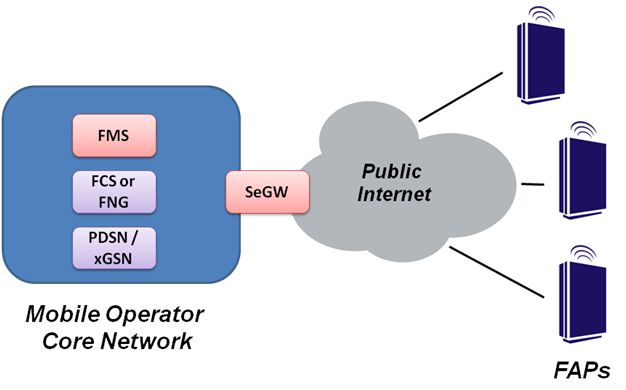 Two other elements that are in all femtocell network architectures are entities that enable connectivity to the mobile operator core. Depending on the specific architecture used for circuit switched calls, there can be either a Femtocell Convergence Server (FCS) or a Femtocell Network Gateway (FNG). For packet calls, depending on the airlink technology, there can be either a PDSN or xGSN (GGSN/SGSN) in the core. In most cases, the PDSN / xGSN are the same as those used for macro networks. Source