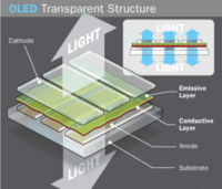 Transparent OLEDs have only transparent components (substrate, cathode and anode) and, when turned off, are up to 85 percent as transparent as their substrate. When a transparent OLED display is turned on, it allows light to pass in both directions. A transparent OLED display can be either active- or passive-matrix. This technology can be used for heads-up displays. [source]