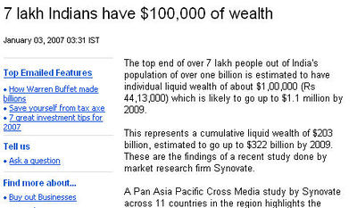 - The top end of over 700,000 people out of India's population of over one billion is estimated to have individual liquid wealth of about $1,00,000 (Rs 44,13,000) which is likely to go up to $1.1 million by 2009. This represents a cumulative liquid wealth of $203 billion, estimated to go up to $322 billion by 2009. These are the findings of a recent study done by market research firm Synovate.