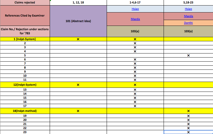 The following Claim vs Reference chart lists out claim and reference wise rejection. This chart provides birds eye-view of the claims in the Application and the rejections given by Examiner and the corresponding references cited against the claims.