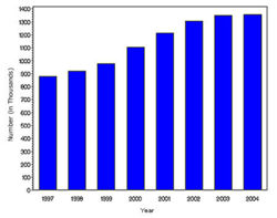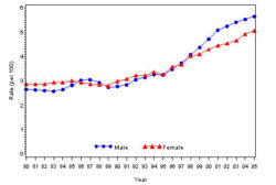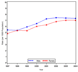 In year 2004, diabetes ( Both type I and type II ) was diagnosed in 1.4 million adults between the age of 18-79 years (Figure 1). The incidence of diabetes was lower in adults having an age between 18-44 years compared to other groups (Figure 2). From 1997 through 2004, the age adjusted incidence of diagnosed diabetes ( Both type I and type II )increased by 35% among men and 46% among women (Figure 3).