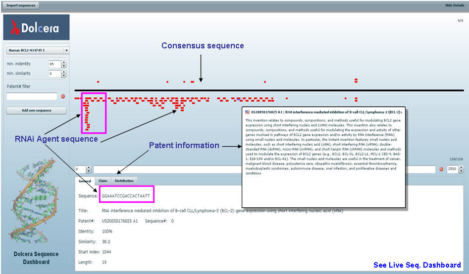 Sequence dashboard allows comparison of siRNA agents extracted from patents and scientific literature to the consensus sequence. Since not all the documents disclose the target sequence, the consensus sequence has to be identified and used for sequence dashboard. For example for Bcl-2, consensus sequence is retrieved from NCBI having seq. id M14745.