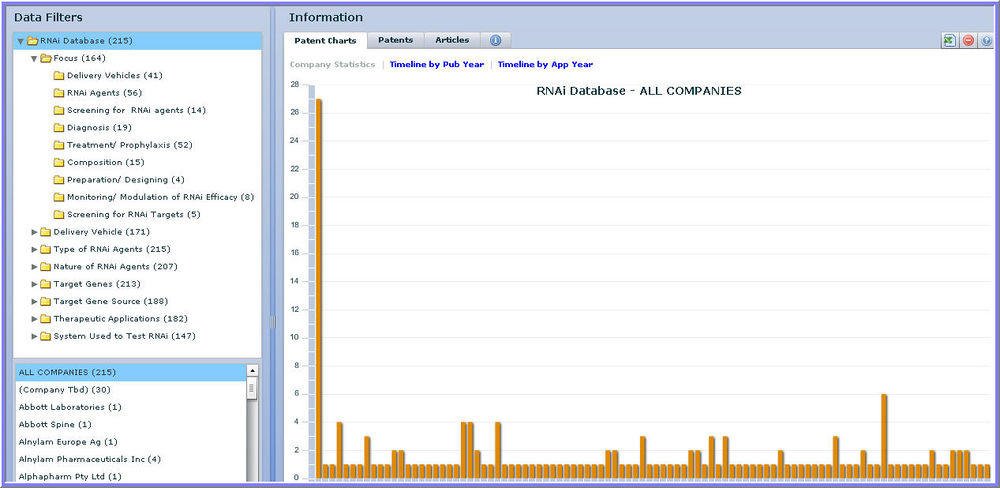 The dashboard also depicts the associated information with RNAi agent on the click of your mouse such as patent number, patent title, length of RNAi agent (siRNA), identity score etc.