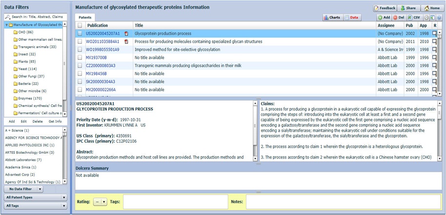 Patents were categorized on the basis of patent focus- whether novel or modified cell lines or hosts, transgenic animals, novel enzymes, chemical/cell free methods of synthesis, and novel fermentation methods or culture conditions. Only those patents with method of manufacture of therapeutic glycoproteins as their focus have been considered in this analysis.