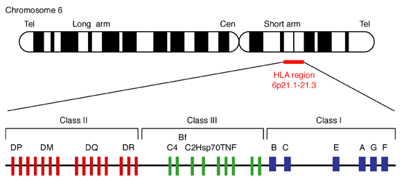 The HLA is located on chromosome 6p21.31 and covers a region of about 3.6 Mbp depending on the haplotype. The classical HLA antigens encoded in each region are HLAA, -B, and -Cw in the class I region, and HLA-DR, -DQ and -DP in the class II region. All class I genes are between 3 and 6 kb, whereas class II genes are 4-11 kb long.