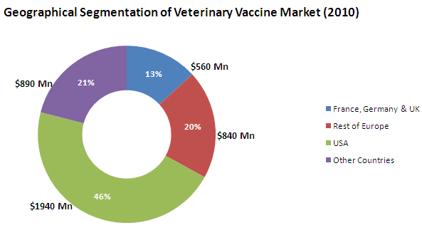 • United States represents the largest market for Veterinary vaccines worldwide, with the market share of 46% and market size of $1.94 Bn in 2010.