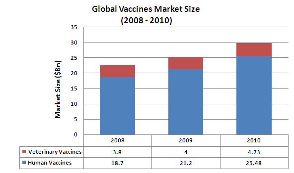 • The global market for human vaccines in 2008 was $18.7 Bn and, with a continuing increase in the global market, reached $25.48 Bn in 2010.