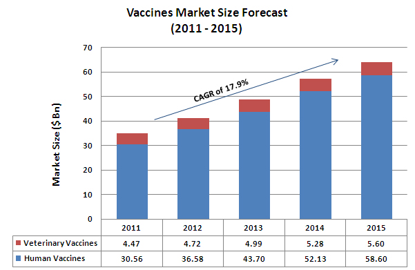 • The global sales of human and animal vaccines were $22.5 Bn in 2008. In 2010, it has reached approximately $29.71 Bn. The global vaccines market grew at a compound annual growth rate (CAGR) of 14.91% in 2008-2010.